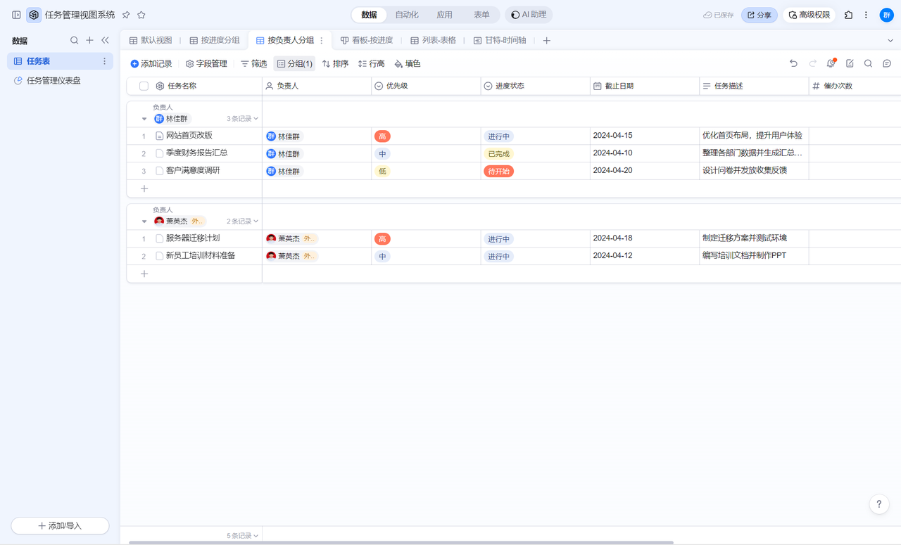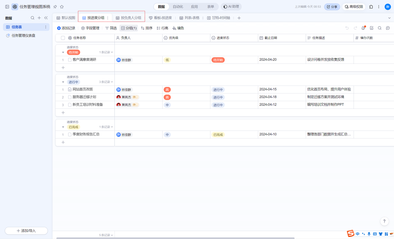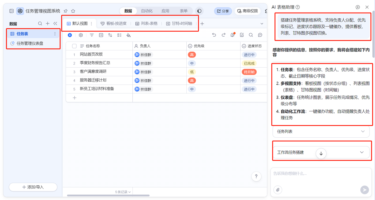 搭建任务管理表格系统,支持负责人分配、优先级标记、进度状态跟踪及一键催办,提供看板、列表、甘特图多视图切换。