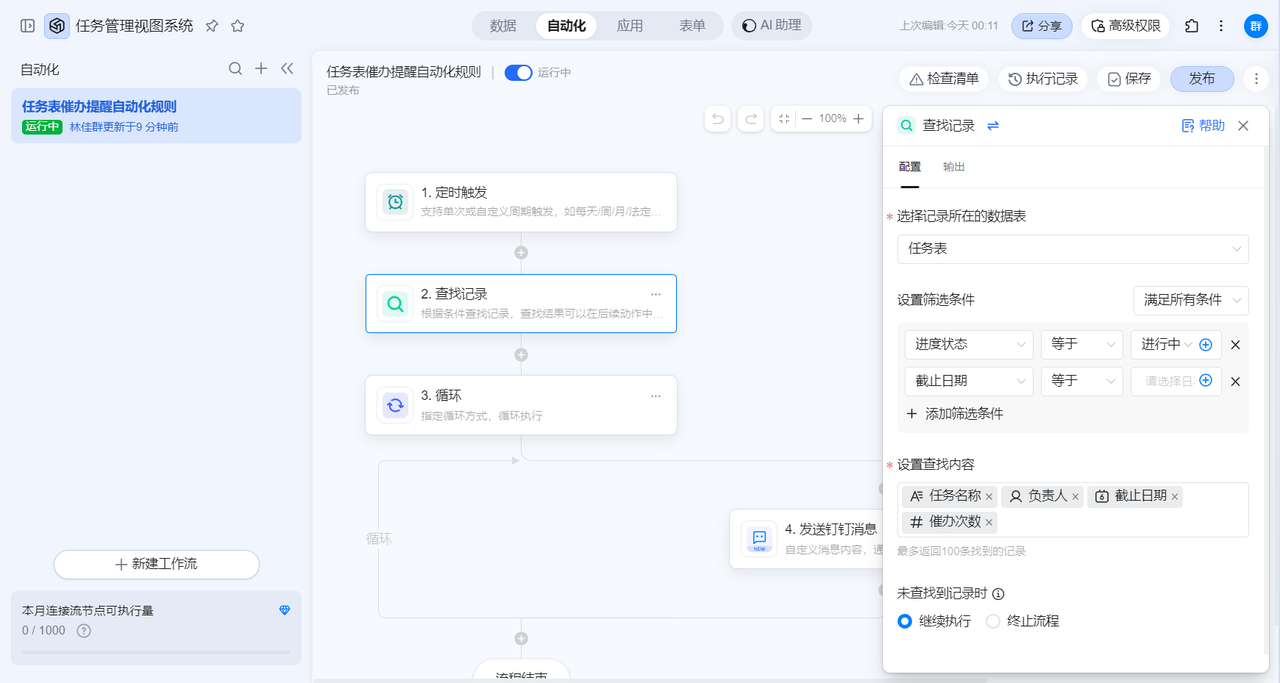 - 预设工作流:“一键催办”按钮已经建好,甚至连“任务状态变更提醒”都设好了,比如研发把“网站首页改版”从“进行中”改成“已完成”,我和测试会立马收到钉钉通知,不用再等研发手动说。