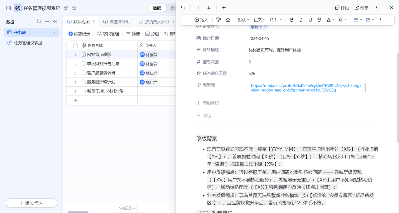 - 核心表格:字段比我想的还全,除了“任务名称”“负责人”“优先级”“进度”,还有“截止日期”“依赖任务”(比如“首页改版”要等“设计图定稿”完成)“任务描述”“附件链接”;
