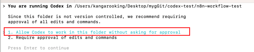终端执行codex启动,选择允许Codex在这个文件夹中工作,且不需要每次请求批准