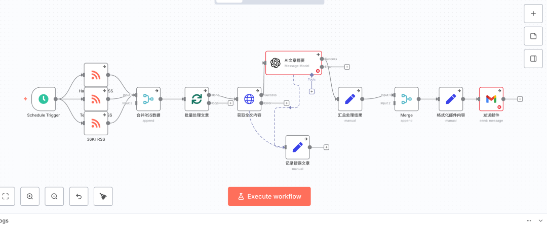 错误处理:在“获取全文”或“AI 总结”的步骤中,如果某篇文章处理失败(例如链接无法访问、AI 返回错误),工作流不应中断。它应该能跳过这篇出错的文章,继续处理下一篇,并最好能记录下失败的文章链接。