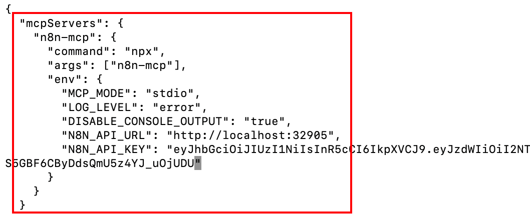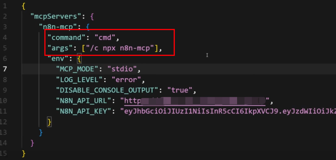 env= { MCP_MODE =”stdio”, LOG_LEVEL =”error”, DISABLE_CONSOLE_OUTPUT =”true”, N8N_API_URL =”https://your-n8n-instance.com”, N8N_API_KEY =”your-api-key”}