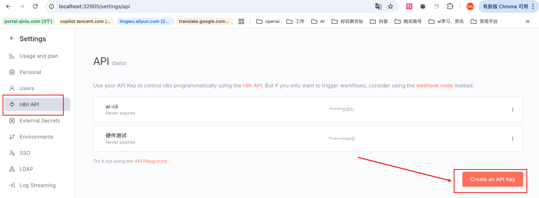这里创建的apikey,作为n8n-mcp配置里面的N8N_API_KEY