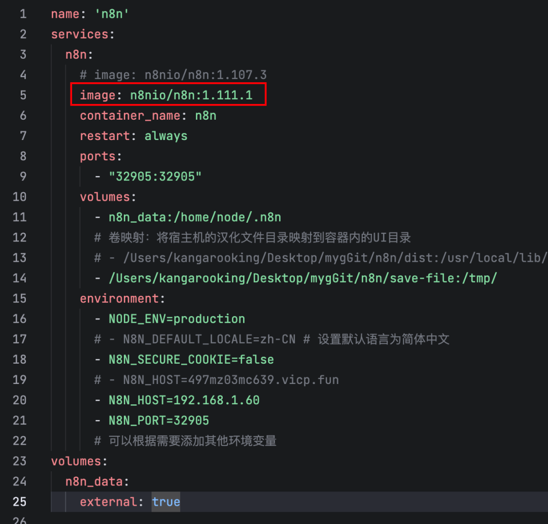 目前最新版是1.111.1,修改一下我的n8n docker-compose.yml文件