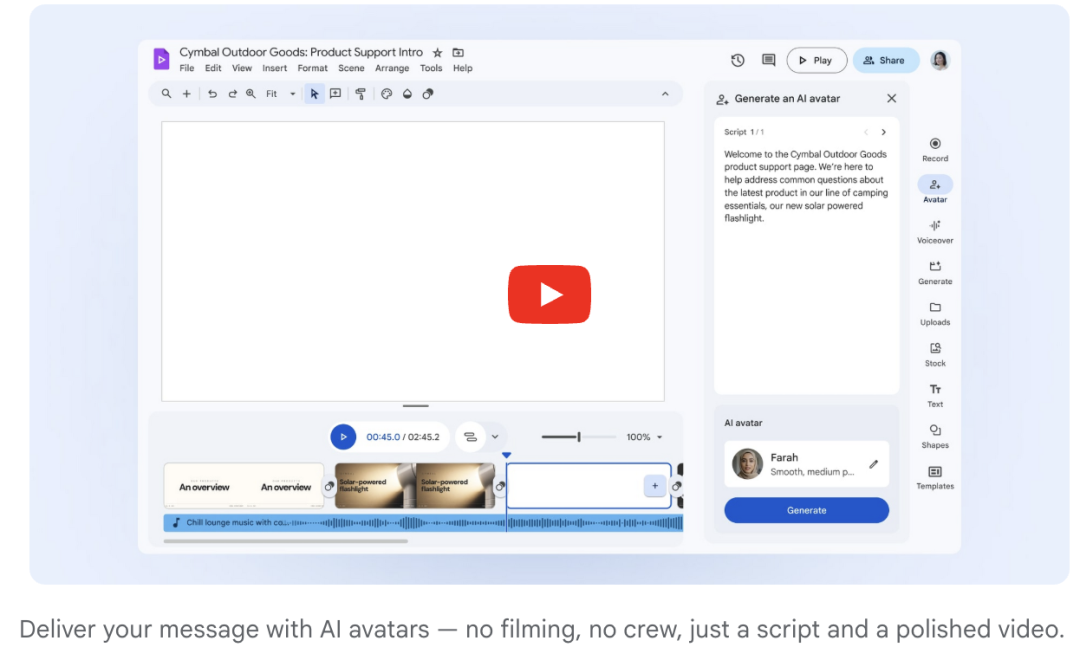 比如,谷歌Workspace最近推出了AI虚拟形象,可以为企业快速生成用于入职培训、公告、产品说明等的AI视频。它在声明中表示,已经挑选了“专业、具有代表性的演员”来提供表演素材,并用于合成声音和形象。