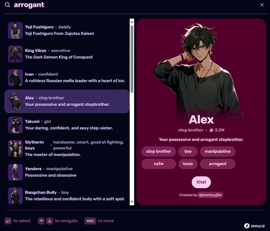 Dippy对其虚拟角色采取了独特的性格分类方式,将角色划分为傲慢、讽刺、狠毒等带有负面特质的人格类型,且除了咨询师角色,每个角色都有特定的人物脚本,旨在为用户提供一种充满反差和张力的聊天体验,通过挑战与征服这类非常规角色,获得新鲜的情感刺激。