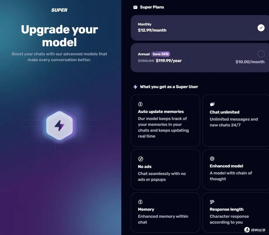 据Dippy官方数据显示,超级模式采用订阅模式,12.99美元/月,119.99美元/年。订阅用户可享受无限聊天、无广告、记忆增强、自定义回复长度及图片共享等高级权益。另外两种基础模式目前仍可免费使用,但部分高级功能及角色图片获取次数存在限制,用户需通过观看广告解锁更多权益。