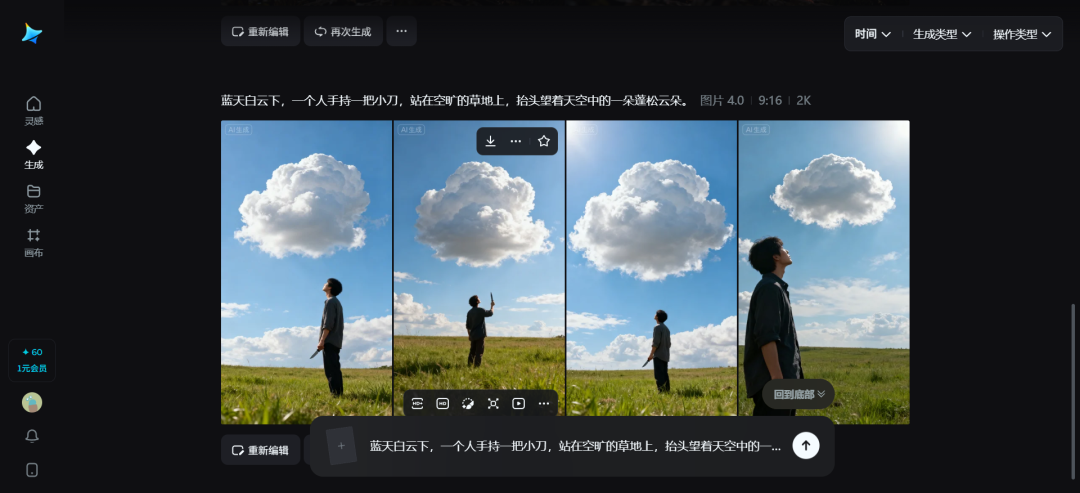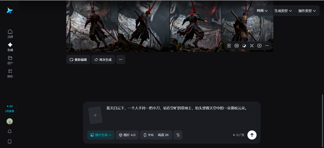 然后这时候,即梦就帮我们生成好相应的图片了,当然效果不满意,可以尝试重新生成或者更改提示词: