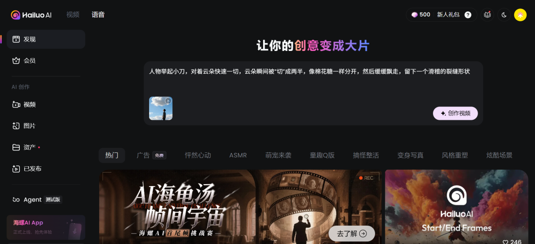 好,现在有了图片之后,我们要做的就是把图片转化为视频,那么我们需要用到的是海螺AI(https://hailuoai.com/)