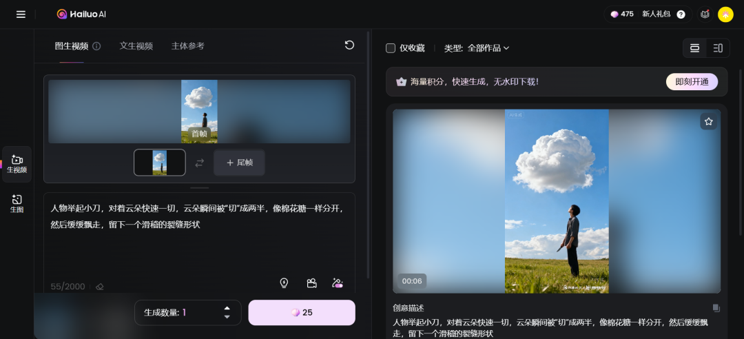我们复制好了之后,在海螺AI的输入框粘贴我们的提示词,同时把第二步我们下载好的图片进行上传