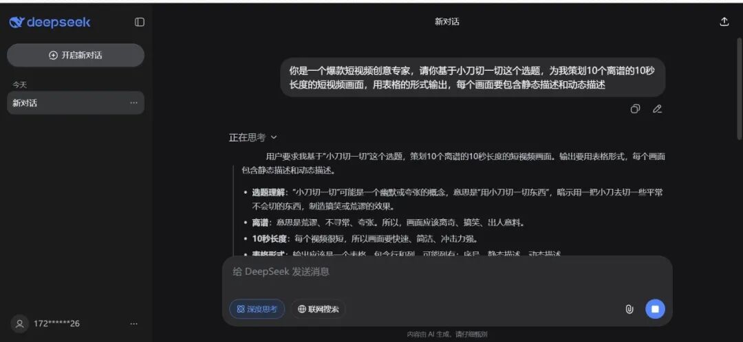 那么第一步创意策划使用DeepSeek就完成了,当然如果你觉得它生成的提示词不是很满意,可以点击最下方的重新生成,直到生成你满意的效果为止。