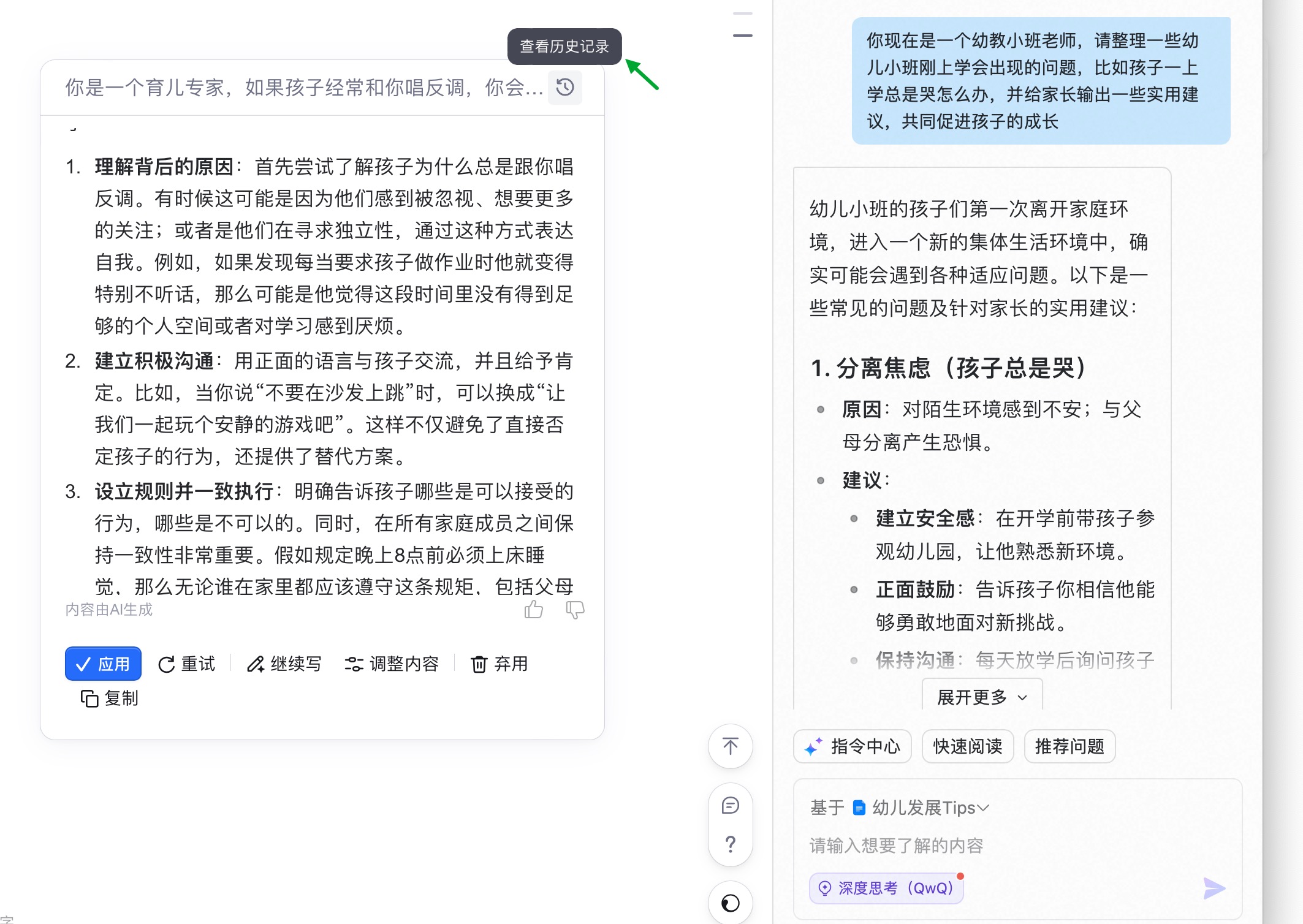 AI的能力出现得“恰到好处”。在创建AI agent时,它能帮你润色描述;在知识库文档中,它能帮你创作、续写、调整文风,这种设计确保了AI工具“有用”,而不是一个华而不实的摆设。