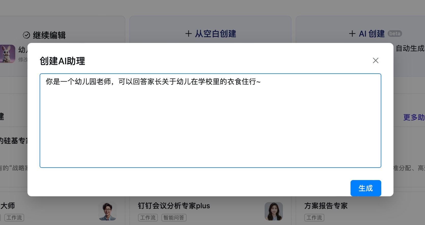 点击AI创建,进入创建页面,只简单描述了一些助理的职责,而AI则会自动润色。