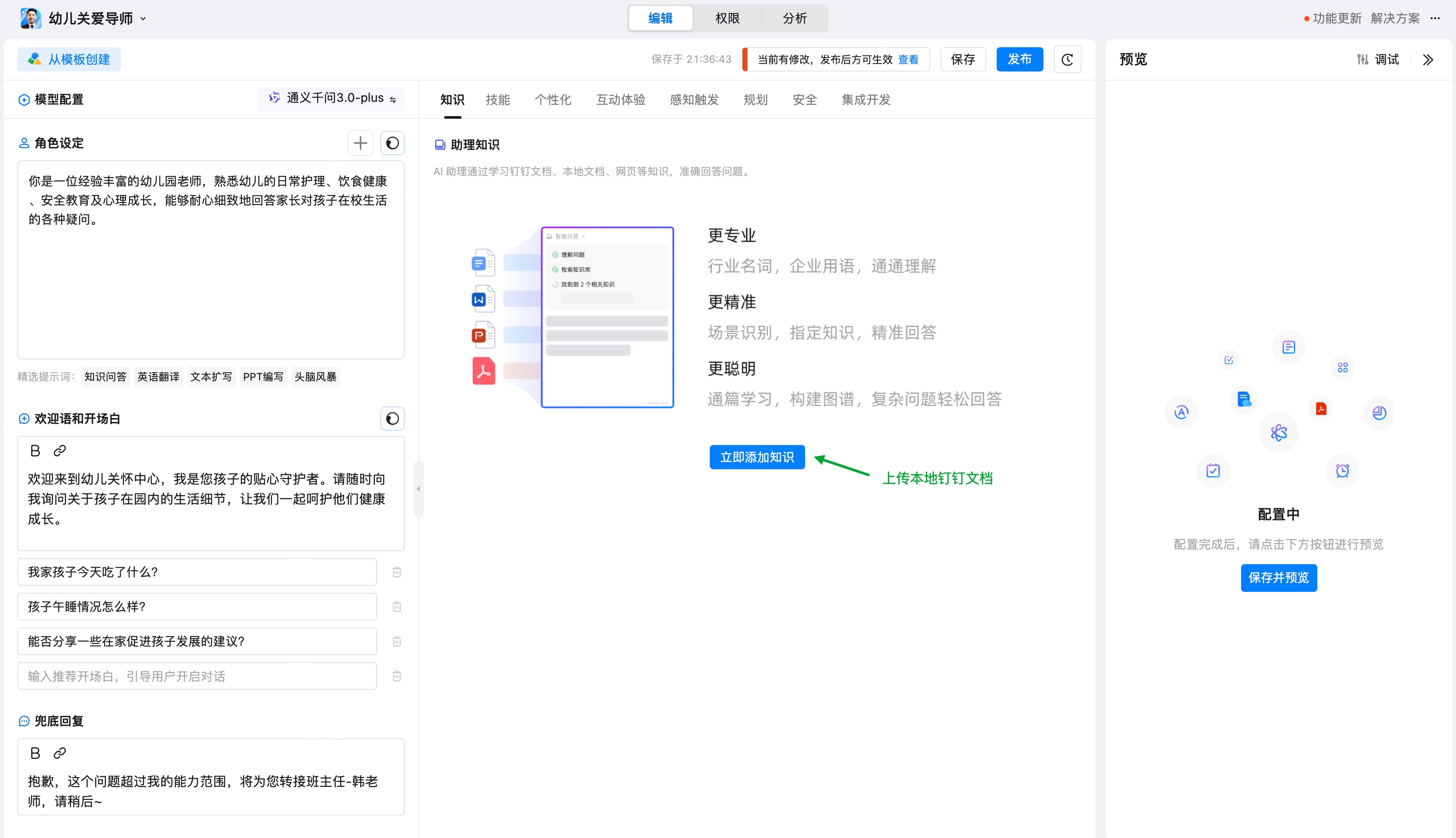 来到了agent最头疼的一步,添加知识库文档。家长想了解的幼儿当天睡眠、吃饭、活动等,都是老师需要通过钉钉文档输入的。