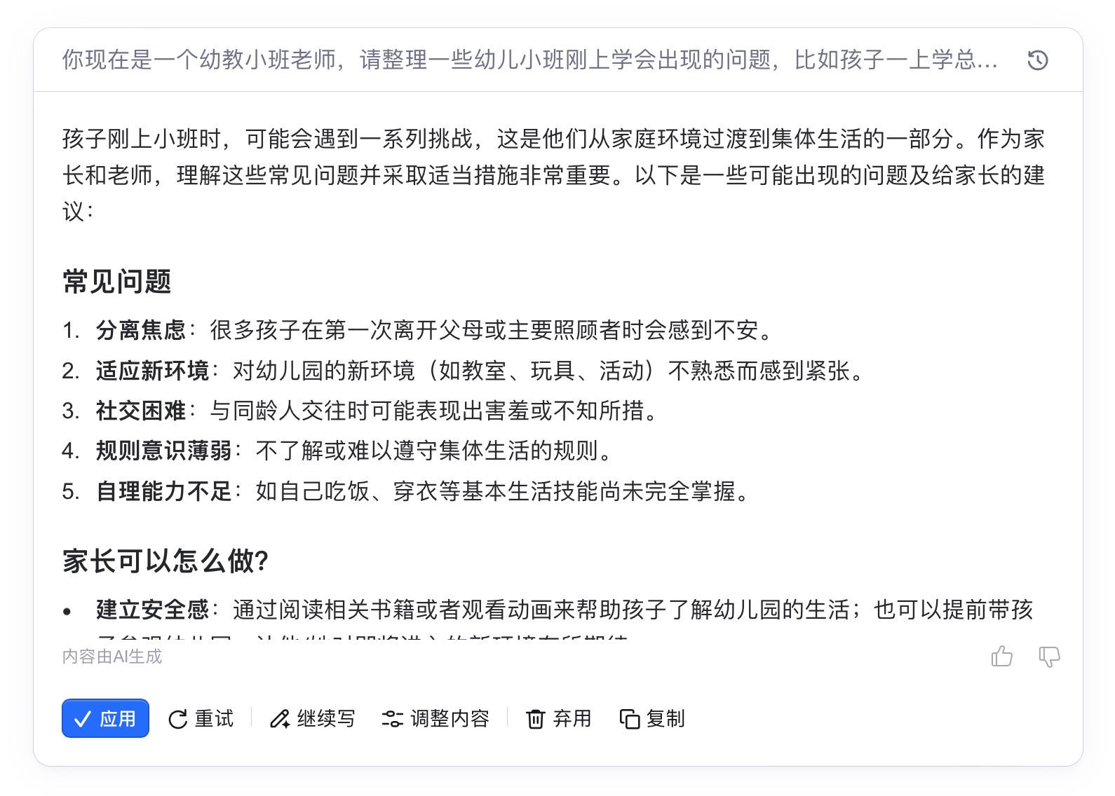 所有的AI操作在最终被插入到输入框或文档前,都是可预览、可取消的。用户可以无限次地“重新生成”,直到满意为止,而不会对实际工作内容造成任何破坏性影响。