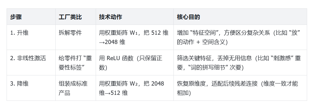 FFN 的结构看似简单(升维→激活→降维),但每一步都有深意。我们可以把它比作一个 “智能工厂”,专门加工 “词向量(token)”: