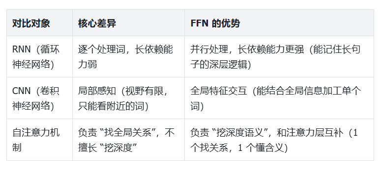 很多人会问:FFN 和 RNN、CNN、注意力层有什么区别?其实它们不是 “替代关系”,而是 “互补关系”,但 FFN 在关键场景下有不可替代的优势: