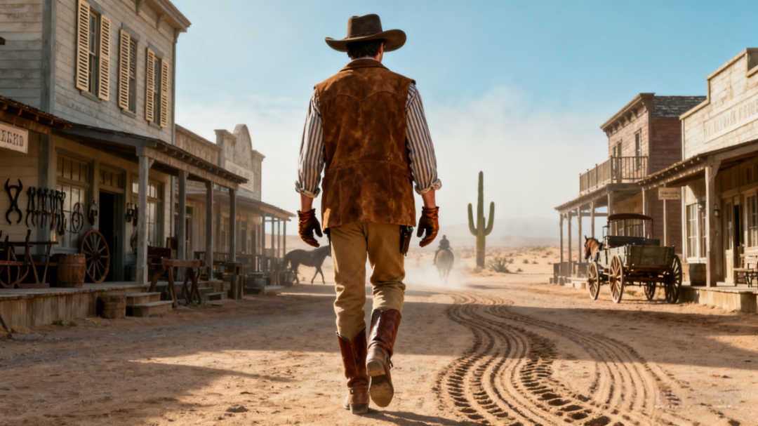 1-5s镜头跟随,牛仔走向右方马车。6-10s人物向前走,镜头跟随。11-15s人物向前走,镜头跟随,右摇16-20s镜头跟随,牛仔推开门进去。