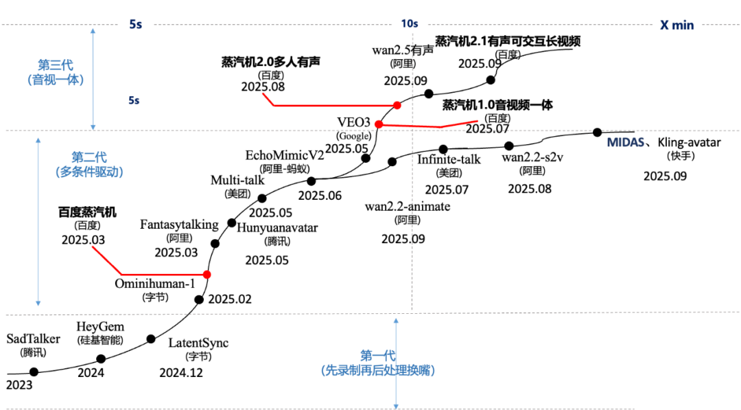 在我印象中,百度这个「蒸汽机」模型应该是业内首个实现长视频生成的技术。在这张“AI视频生成模型技术发展路径图”里,他们最近真是卷疯了。
