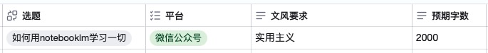 – 打开表格,在“选题”栏输入:“如何用Notebooklm学习一切”