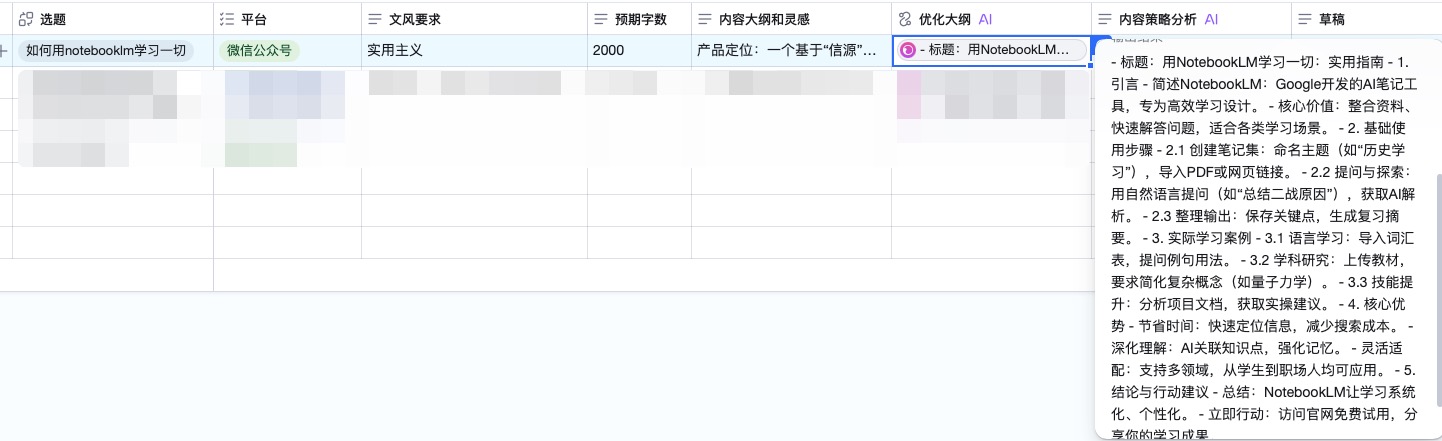 核心思路:通过将上面的创作流程汇总到一张表格中,只需写几个字就可以启动这个创作飞轮。把创作拆解为可自动运转的环节,彻底降低行动门槛,再也没有理由不写了。这张表不是普通的灵感记录、选题收集,而是精准集成AI能力的智能创作引擎。