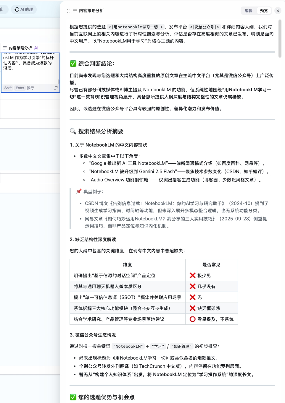 - AI介入点2:内容策略分析通过全网搜索,了解当前互联网各大内容平台中是否已有类似内容的发布情况。根据搜索结果生成创作建议:与当前选题类似的直接竞争内容、差异化优势评估、内容创作建议等。