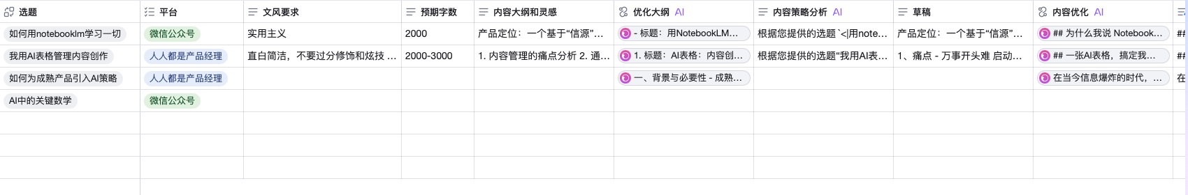 以上就是我的日常困境,直到我用一张AI表格重新串联了创作流程,让内容生产从挤牙膏变成一个高速运转的飞轮,让我可以快速跑通选题、构思、创作到发布的全流程。今天就把这套实操方法分享出来。
