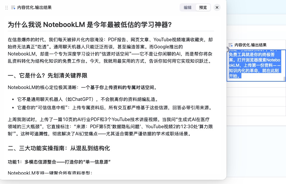 (值得一提,表格自带的markdown预览功能也非常方便,可以更直观的浏览AI输出的内容。)