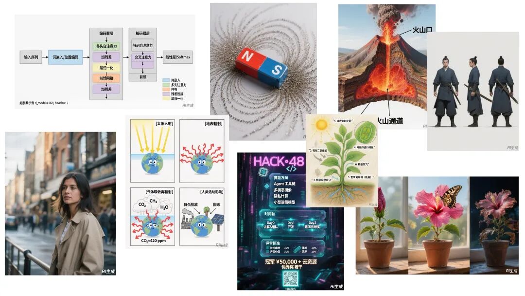 混元图像3.0自带世界知识,能推理后生成图片,可以理解千字级别的复杂提示语,长文本文字和小文字都可以生成。