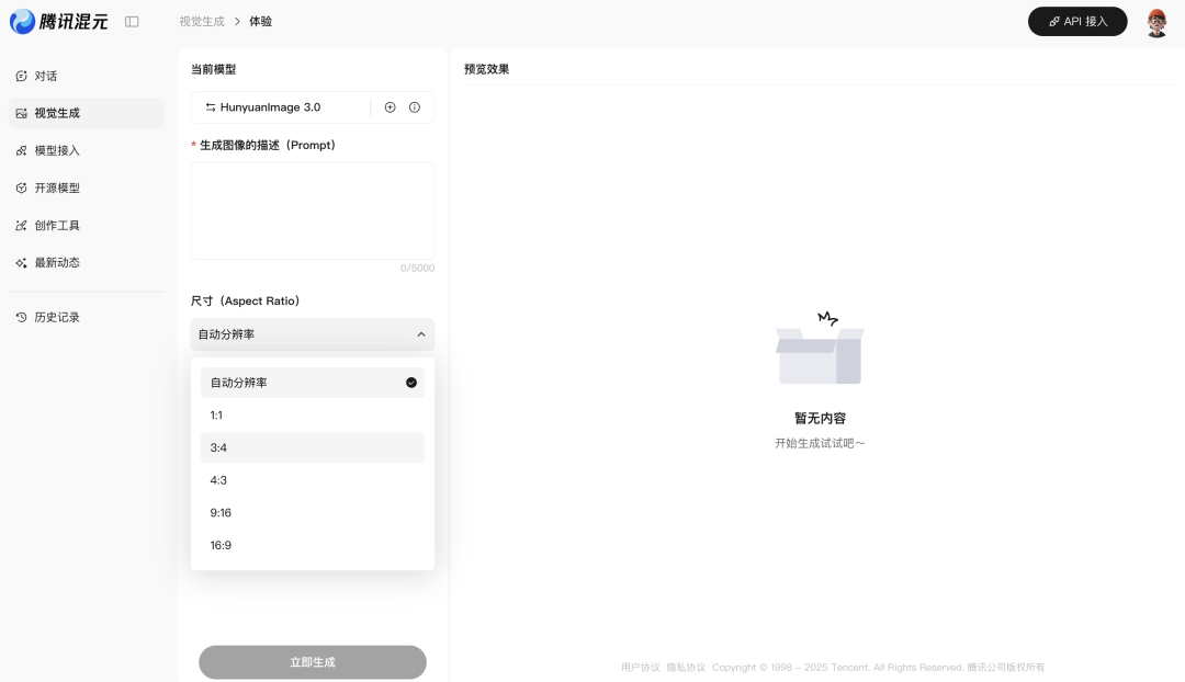 热知识,混元图像3.0刚上线就可以限制尺寸,1:1、3:4、4:3、9:16、16:9,都是很实用的尺寸。
