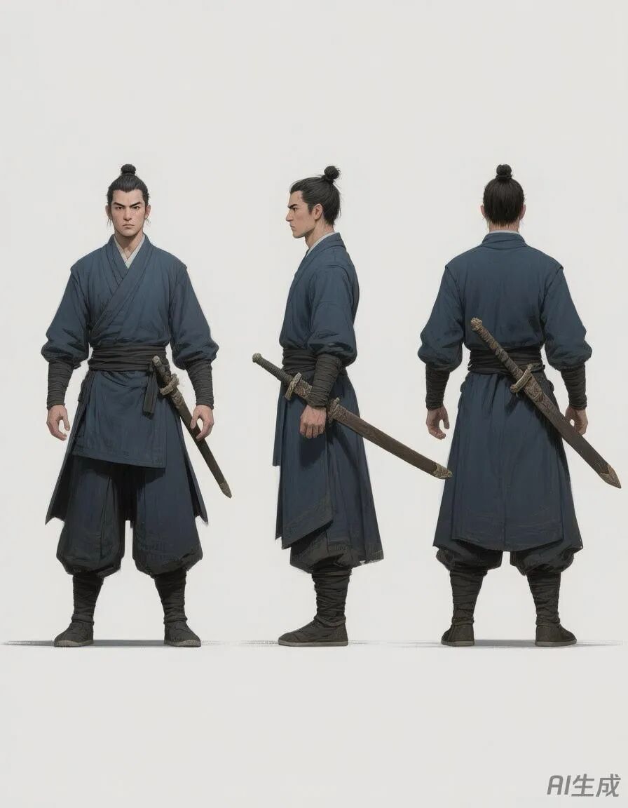 首先来个最简单的,生成一个古代剑客的三视图,这里混元需要了解两个知识“什么是古代剑客”和“什么是三视图”。很明显,混元非常轻松的做到了,不仅正确的输出了人物形象、做出了三个角度的展示、也保持了形象一致。而且我还能直接用混元3D做一个模型出来。
