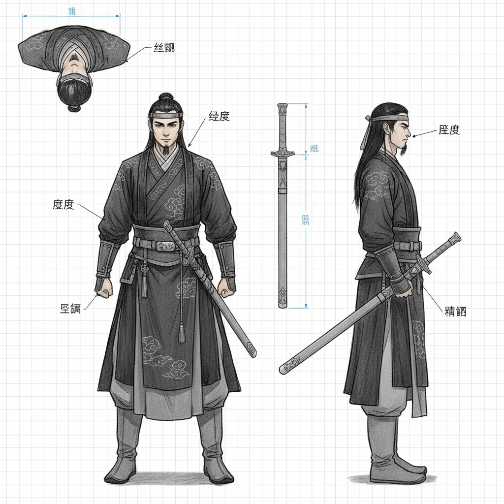 你可能以为这很简单啊,现在生图模型一般都能做得到吧,但当我把同样的提示语丢给nano banana时,我得到的效果是这样的,嗯,也算是三视图吧,但有几个正常人画人物三视图会画一个俯视图呢,这是反一般常识的,而且人物佩剑的方向也不一致。