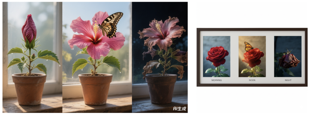 同一盆花从早晨到夜晚的三连景:含苞→盛开→萎蔫;只有正午时有蝴蝶停驻。