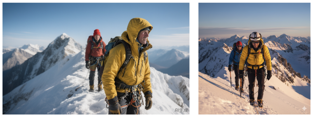 两位登山者,前者在焦点上、后者虚化;前者穿黄夹克,后者红帽子但不戴墨镜