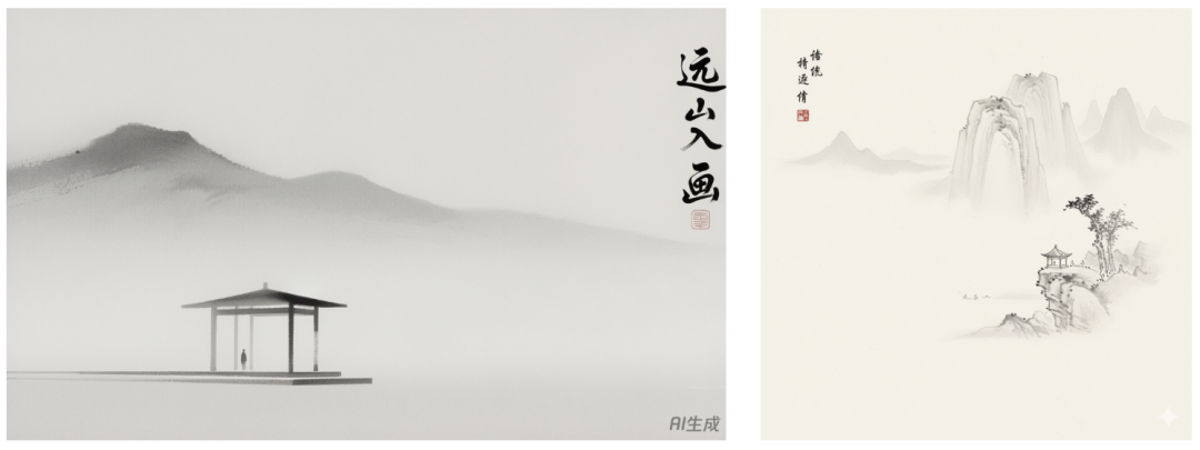 提示语提到了“水墨和现代的融合”,很明显混元的画面中更具备“现代亭子”的极简线条风格,甚至还能配出书法字体的题字,而banana就只是水墨而已。