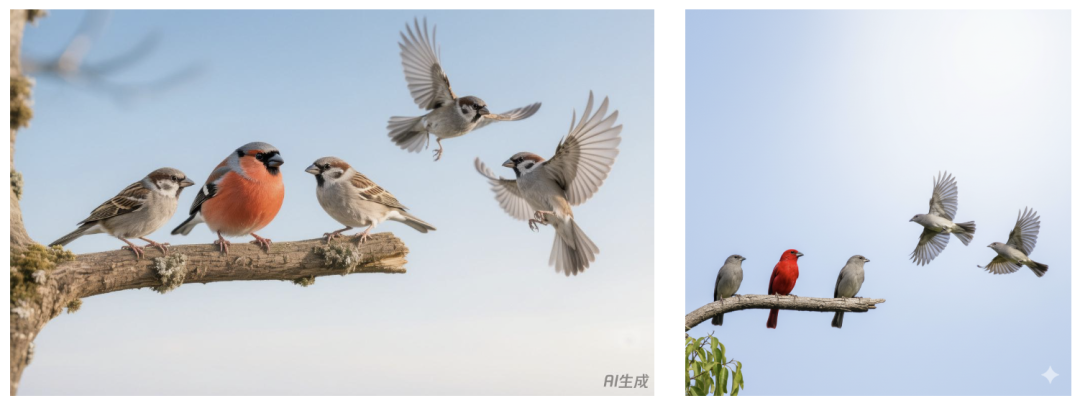 这张图两个模型都执行到位了,但在这个基础上,我觉得混元图像3.0的画面精细度更高,不管是鸟还是树枝都更漂亮。