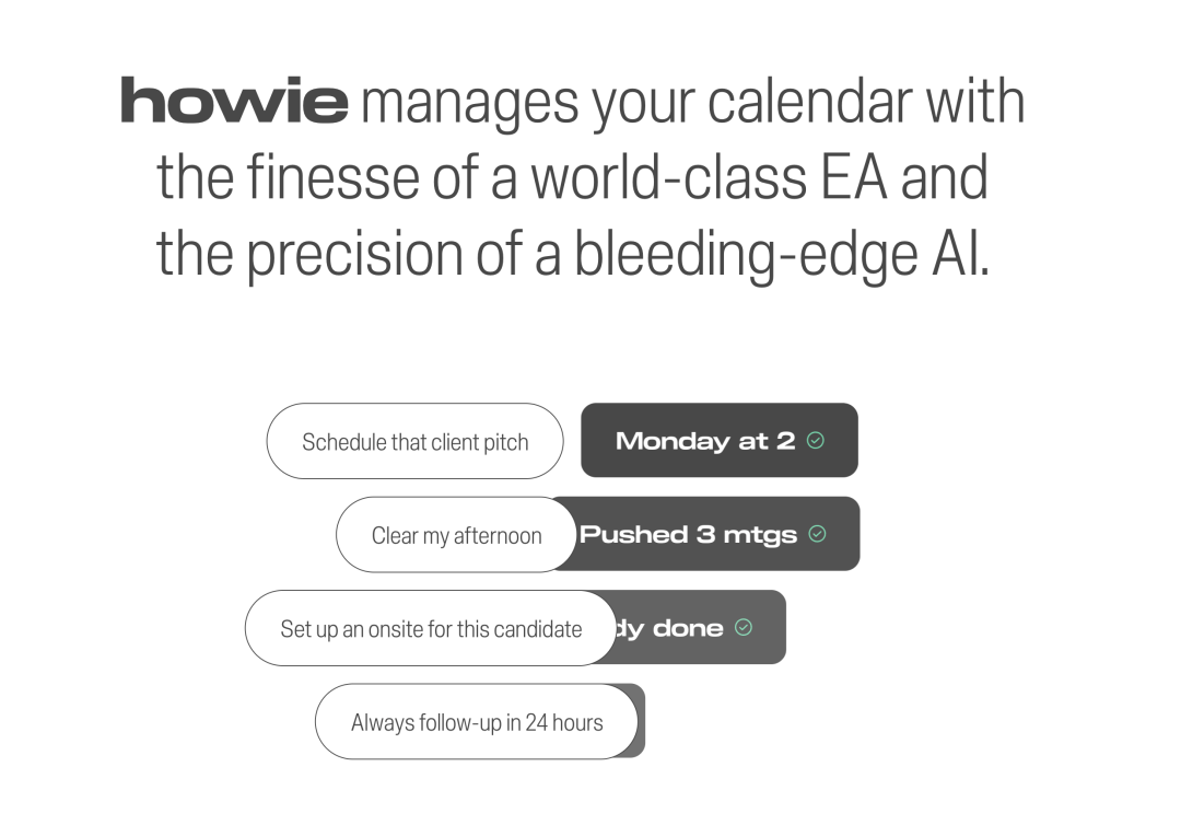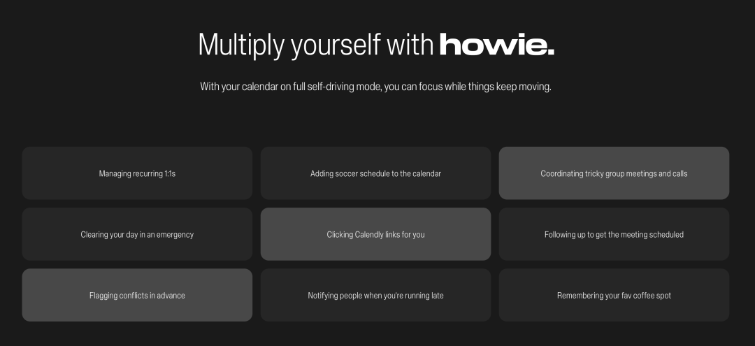我认为Howie的竞争优势主要体现在几个方面:专注度、可靠性和用户体验。与那些试图打造通用AI助手的公司不同,Howie专注于做好一件事,这让它能够在细节上做到极致。其混合AI-人工的架构确保了高可靠性,这对于会议安排这种容错率极低的任务至关重要。而其在邮件中无缝工作的设计,让用户能够以最自然的方式使用它。