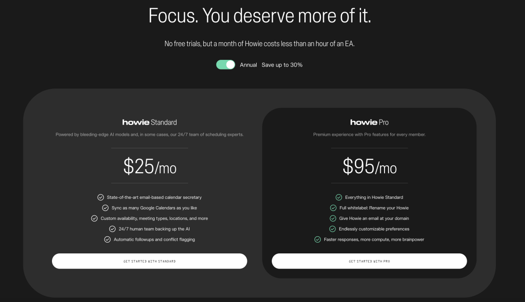 从商业模式角度看,Howie的定价策略非常有趣。标准版本每月25美元,专业版每月95美元,这个价格点既不算便宜也不算昂贵,但它的价值主张非常清晰:一个月的费用比雇佣执行助理一小时的成本还要低。这种定价逻辑直接对标了传统的人力资源成本,而不是其他软件工具的价格。这表明Howie并不把自己定位为另一个生产力软件,而是作为人力资源的直接替代品。