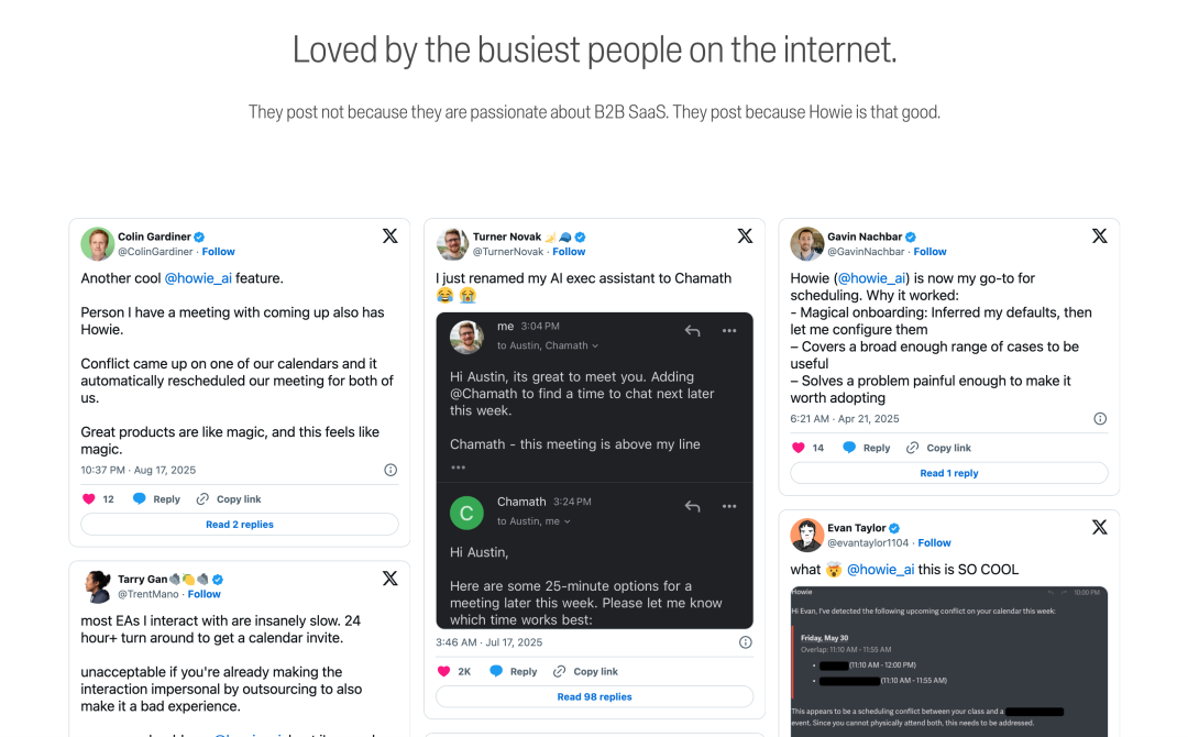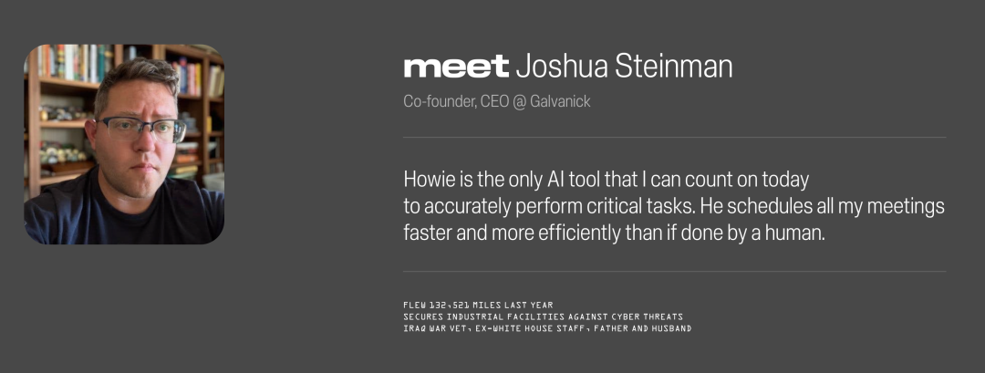 这家名为Howie的西雅图创业公司刚刚完成了600万美元的种子轮融资,背后的故事比融资本身更值得关注。他们已经拥有超过1000名付费客户,每周为这些客户安排超过5000场会议。更关键的是,这些客户中包括了一些我们最熟悉的商界精英:Superhuman的CEO Rahul Vohra用它来”减少日程安排时间,增加为股东创造价值的时间”,All-In播客的Jason Calacanis用它来控制自己的会议节奏,还有数十位创业公司CEO在用它管理从融资到销售的各种复杂会议安排。但更让我印象深刻的是,这些使用者对Howie的描述几乎都带有一种近乎依赖的语气,这在企业软件领域是极其罕见的现象。