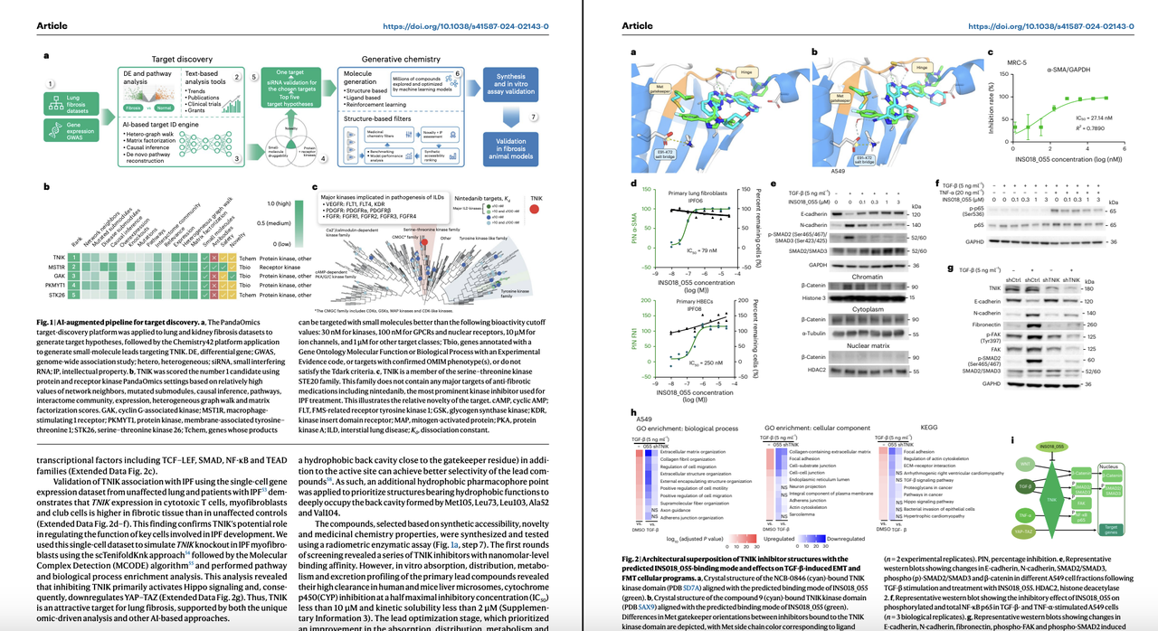 Insilico Medicine是一个标志性案例。他们利用AI平台,通过分析大量组学数据和文献,发现了一个与特发性肺纤维化(IPF)相关的新型抗纤维化靶点。基于此靶点,他们又利用AI设计了候选药物分子,该药物已进入临床试验阶段。这一成果发表在 Nature Biotechnology上,标题为 “A small molecule TNIK inhibitor targets fibrosis in preclinical models”,展示了从AI靶点发现到AI药物设计的完整链条。