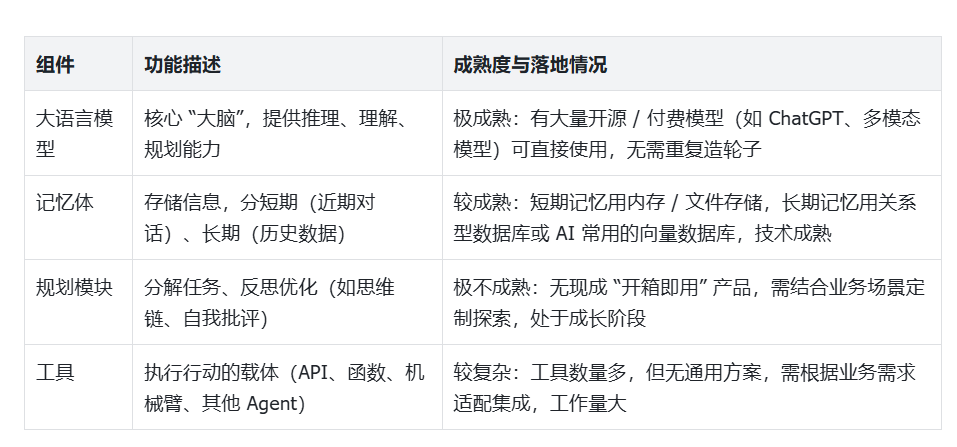 2025 年的 Agent 已不是纯理论,而是有大量落地案例。观察主流产品可发现,一个典型的 Agent 由四大组件构成,但成熟度差异极大,直接影响落地难度: