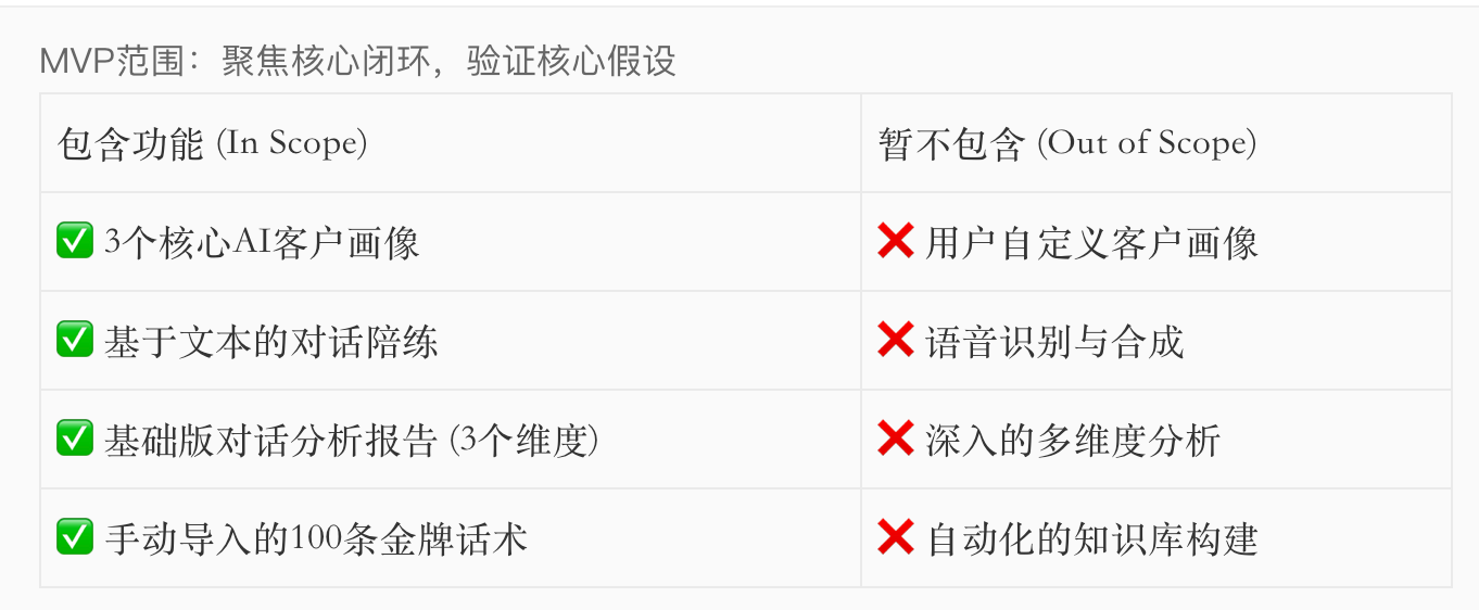 - 明确定义MVP的范围,哪些做,哪些不做。