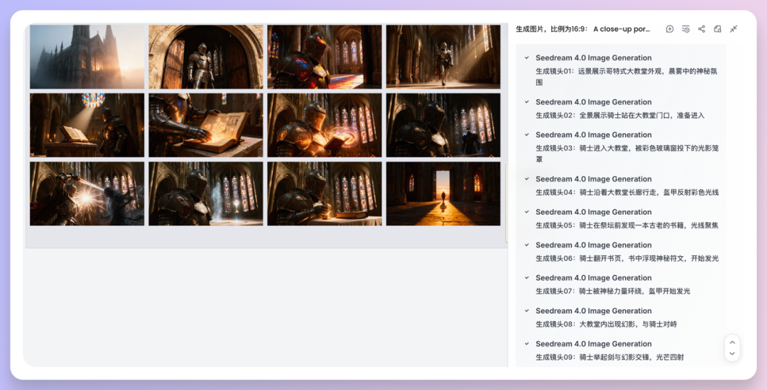 选择上一步的图片做参考,用来做多个静态分镜图,比如我让它生成12张16:9比例的图(提示词为AI优化,供参考):