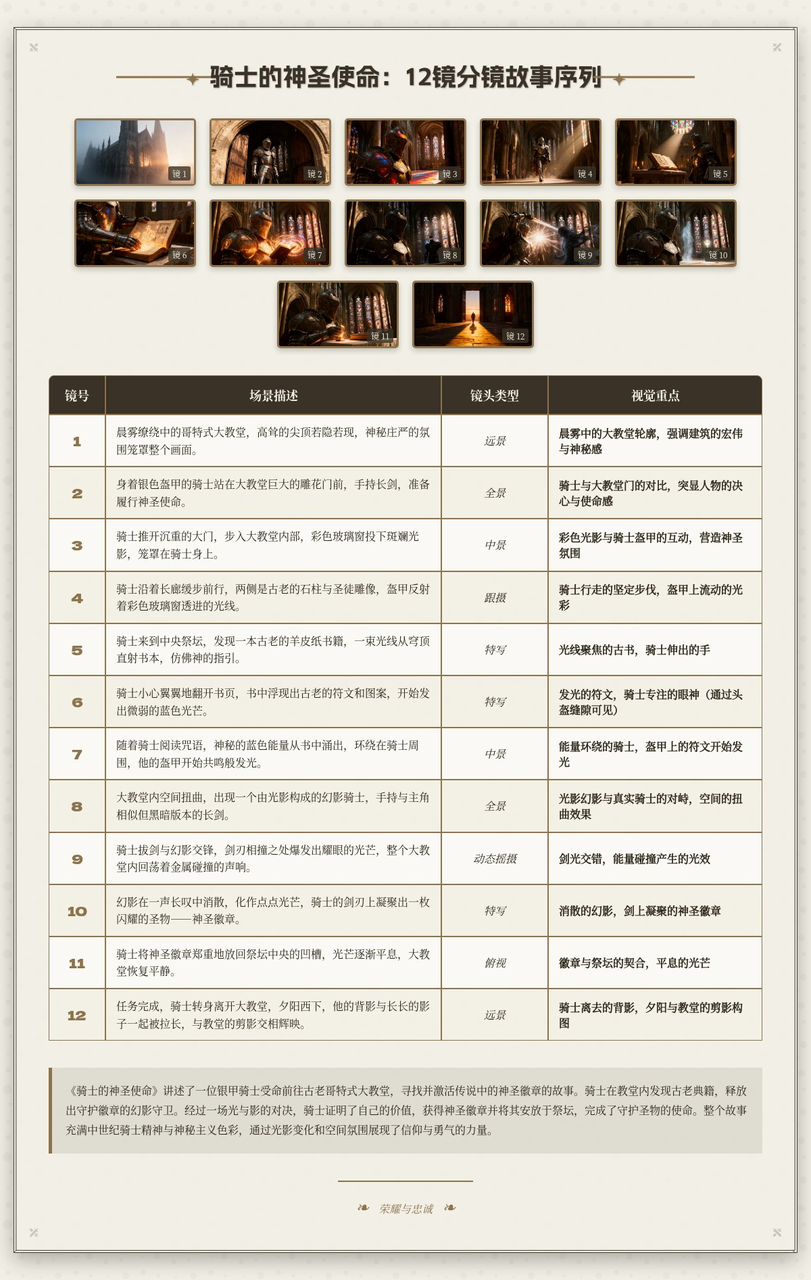 输出格式:表格图,包含”镜号 | 场景描述 | 镜头类型 | 视觉重点”四列