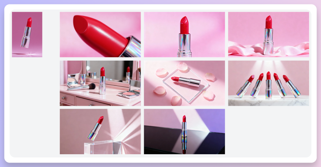 基于这个产品,生成8组不同构图的展示效果图,比例为16:9