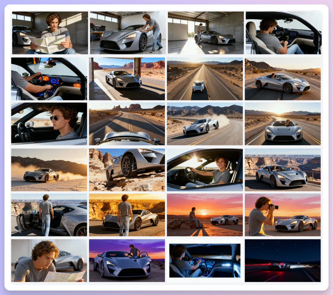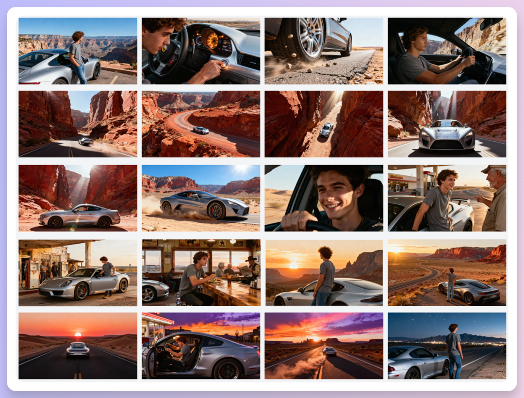 保持这2张图的人物和主体不变,以【XXX参考:男人驾驶赛车驰骋在西部公路上】为主题生成24张完整分镜序列图片。要求包含多种构图(特写/中景/全景/俯视/仰视)、多种场景(室内/户外/不同环境)、多种角度(正面/侧面/背面/斜角),展现完整的叙事或展示逻辑。保持视觉风格统一,最后输出为专业分镜表格。
