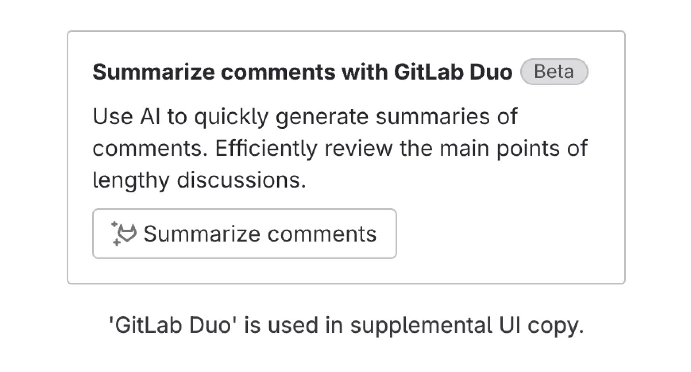 由于” GitLab Duo “仅用于标识 AI 功能模块(不涉及 AI 生成内容),Pajamas 设计体系还建议对 AI 生成内容采用”by AI”的标注方式(如”由 AI 生成摘要”),并附加提示信息引导用户核验内容准确性。