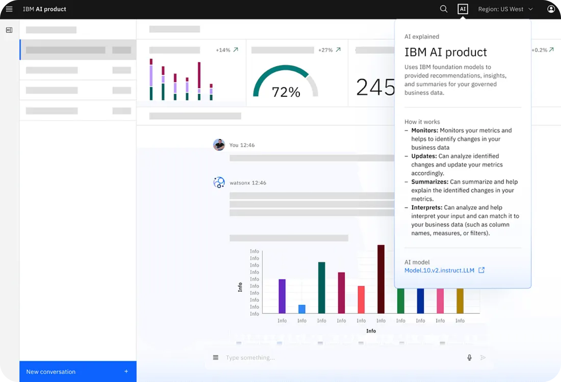除 AI 变体外,该组件还包含一个显性的” AI 标签”,点击后可弹出浮层,详细说明当前场景中 AI 的具体功能(Carbon 将此模式称为” AI 可解释性设计”)。用户点击 AI 标签时,解释性浮层会在按钮下方弹出。