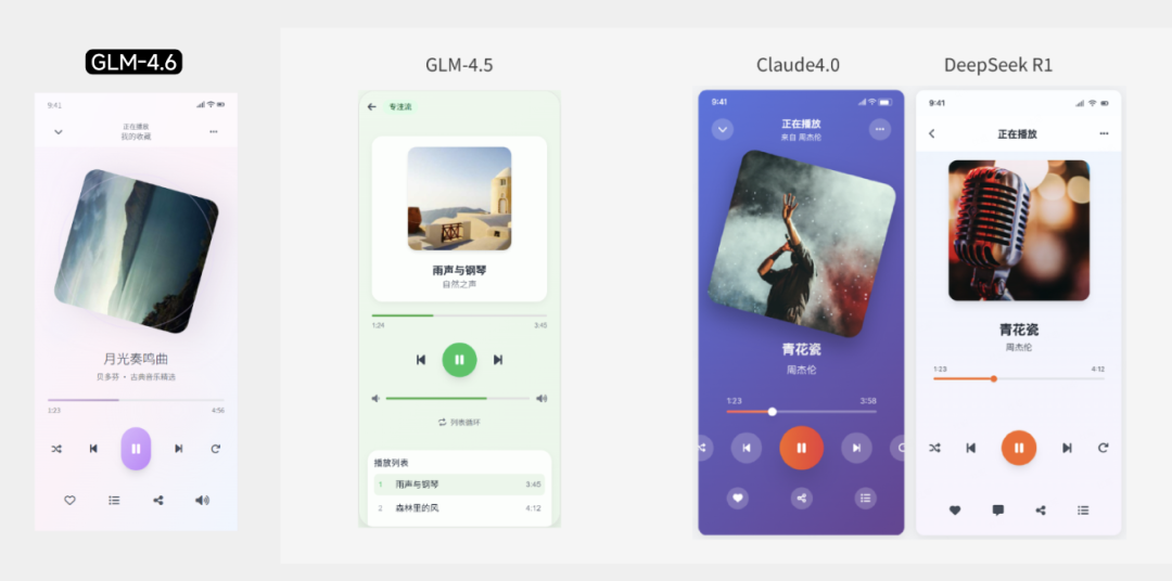 这里我首先注意到的是这个渐变配色,淡淡的粉紫渐变非常漂亮,按钮形状页多了一些变化,不再是呆板的正圆形,UI设计中的导航栏部分相对4.5也更规整了, 封面图部分在4,5中是个弱项,之前Claude4.0输出的设计图中歌曲封面图就支持了大图+旋转,现在GLM-4.6也达到同样的效果了。