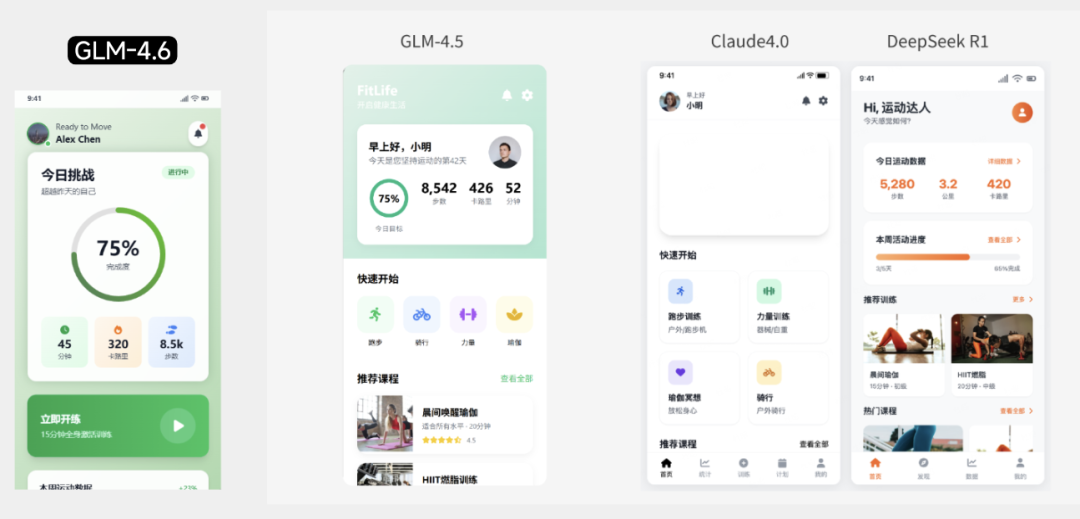 今日调整部分这个大卡片,内部其实包含了多层布局嵌套,一共是三层布局,第一层是大卡片,第二层是完成度与下方3个小卡片(时间、热量那里)的相对布局,第三层的小卡片内部icon、数据、辅助文字的布局。这张较复杂布局在之前的GLM4.5、CLaude4.0、Deepseek R1中都支持的不是很好。